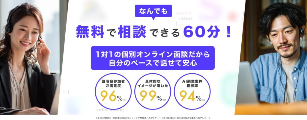 「なんでも答えるジェネラリスト講師1人」ではなく、副業・業務効率化・AIエンジニアリングなど領域ごとに特化したメンターが複数います。5,000人以上のカウンセリング実績をもとに設計されたサポート体制は、現場目線で見ても本気度が伝わります。