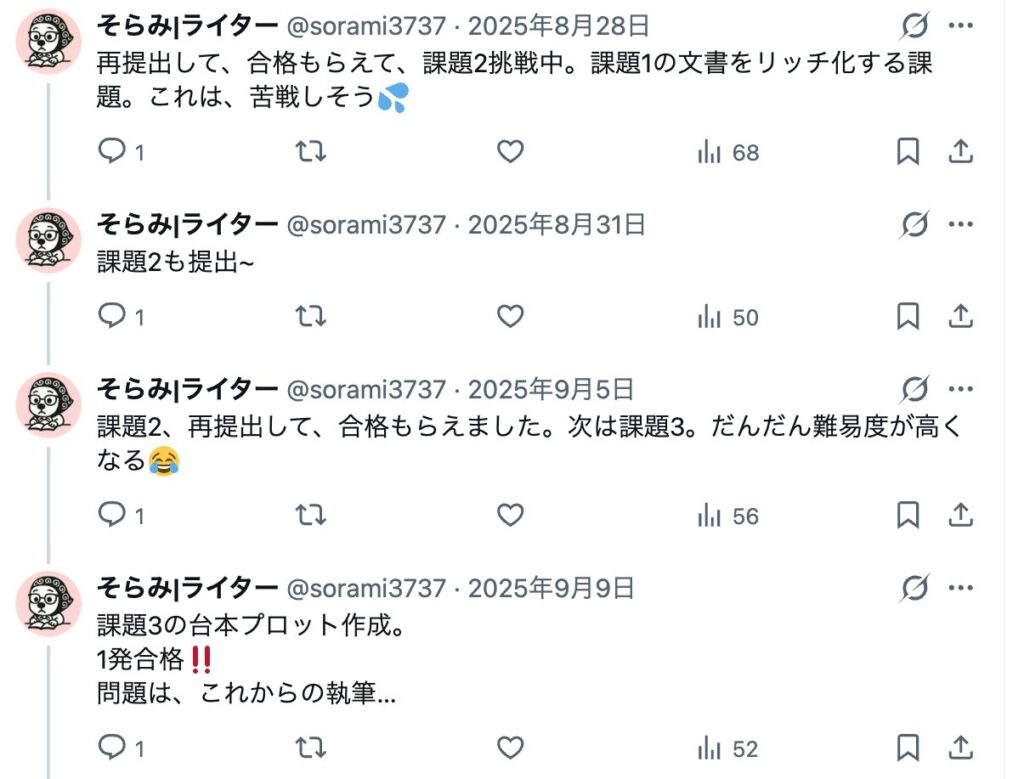 課題1から自身でプロンプトを作成できるようになったポスト。その後も順調に課題を出してスキルアップをしている様子が確認できます。継続できる学習環境が見受けられます。